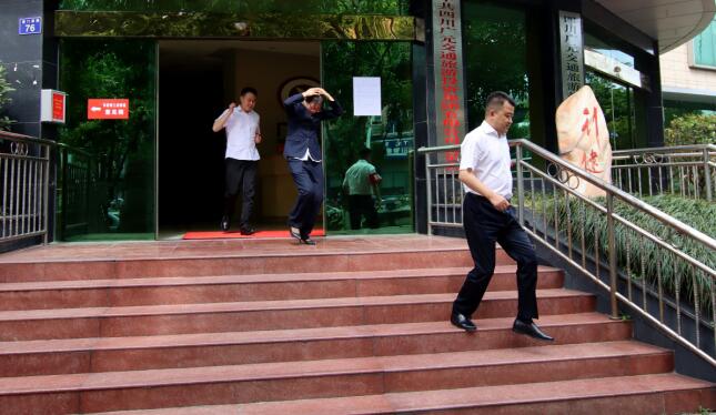 5月12日上午10時,一聲急促的哨聲響徹廣運(yùn)集團(tuán)機(jī)關(guān)辦公樓道,“地震了,大家趕快撤離到安全地帶”。聽到預(yù)警聲,各辦公室工作人員迅速從辦公室奔跑而出,從辦公樓的兩則樓梯向南河車站站前廣場分散撤離。一時間,遠(yuǎn)處傳來的防空警報(bào)聲,緊急的預(yù)警哨聲和奔跑的腳步聲,瞬間匯聚起災(zāi)難來臨時的緊急場景。