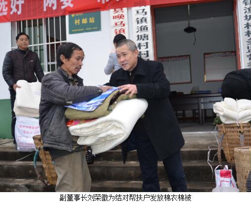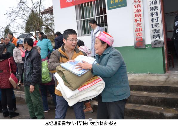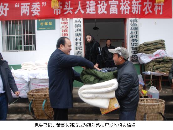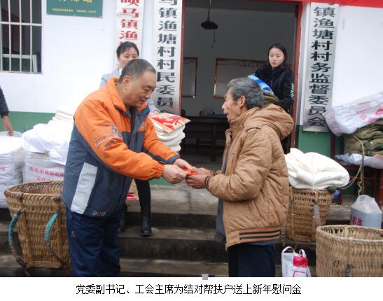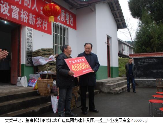 2017年1月10日,集團公司黨委書記、董事長韓治成帶領交旅集團、廣運集團全體領導干部及市石油公司、運通公司、鳳臺酒店、廣運集團市汽車客運站、廣運集團廣錦公司、廣運集團廣元分公司主要負責人等20余人,前往對口幫扶村——蒼溪縣喚馬鎮(zhèn)漁塘村看望慰問建卡貧困戶。送去產(chǎn)業(yè)發(fā)展資金45000元,幫助建卡貧困戶發(fā)展養(yǎng)殖業(yè)(養(yǎng)殖生豬57只、羊2只、雞300只),為他們捎去了春聯(lián)、燈籠、棉衣、棉被等物品,增添年味、送上溫暖。18名幫扶責任人自掏腰包為33戶建卡貧困戶累計發(fā)放慰問金6600元,并通過開展“以購代捐”活動,累計購買建卡貧困戶家中4000余元的雞、鴨、雞蛋、菜籽油、臘肉等商品,該活動將長期開展,有效解決百姓家中商品銷售難的問題。