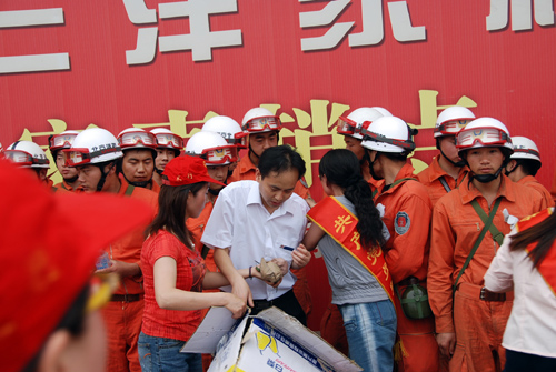 隊和青年志愿者將水果、食品、礦泉水等物品送到