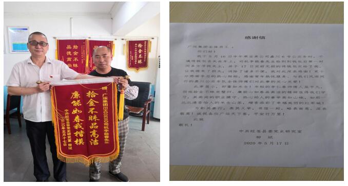 2020年5月16日,柳斌乘坐廣運(yùn)集團(tuán)旺蒼公司川H03838D公交從旺蒼縣城到嘉川鎮(zhèn),途中不慎將錢(qián)包掉在了公交車(chē)內(nèi),當(dāng)班駕駛員李能春在車(chē)輛到站后打掃清潔衛(wèi)生時(shí),在車(chē)輛座位上發(fā)現(xiàn)了一個(gè)錢(qián)包。該駕駛員立即向辦公室報(bào)告了這一情況并將錢(qián)包交至辦公室。經(jīng)查看,包內(nèi)有現(xiàn)金300余元、銀行卡、身份證等貴重物品。經(jīng)辦公室多方聯(lián)系,最終找到了失主劉斌并立即將遺失的物品還給失主。失主柳斌為表達(dá)謝意,特意為公司送來(lái)感謝信和錦旗上面寫(xiě)著:“拾金不昧品高潔、廉能如春我楷!