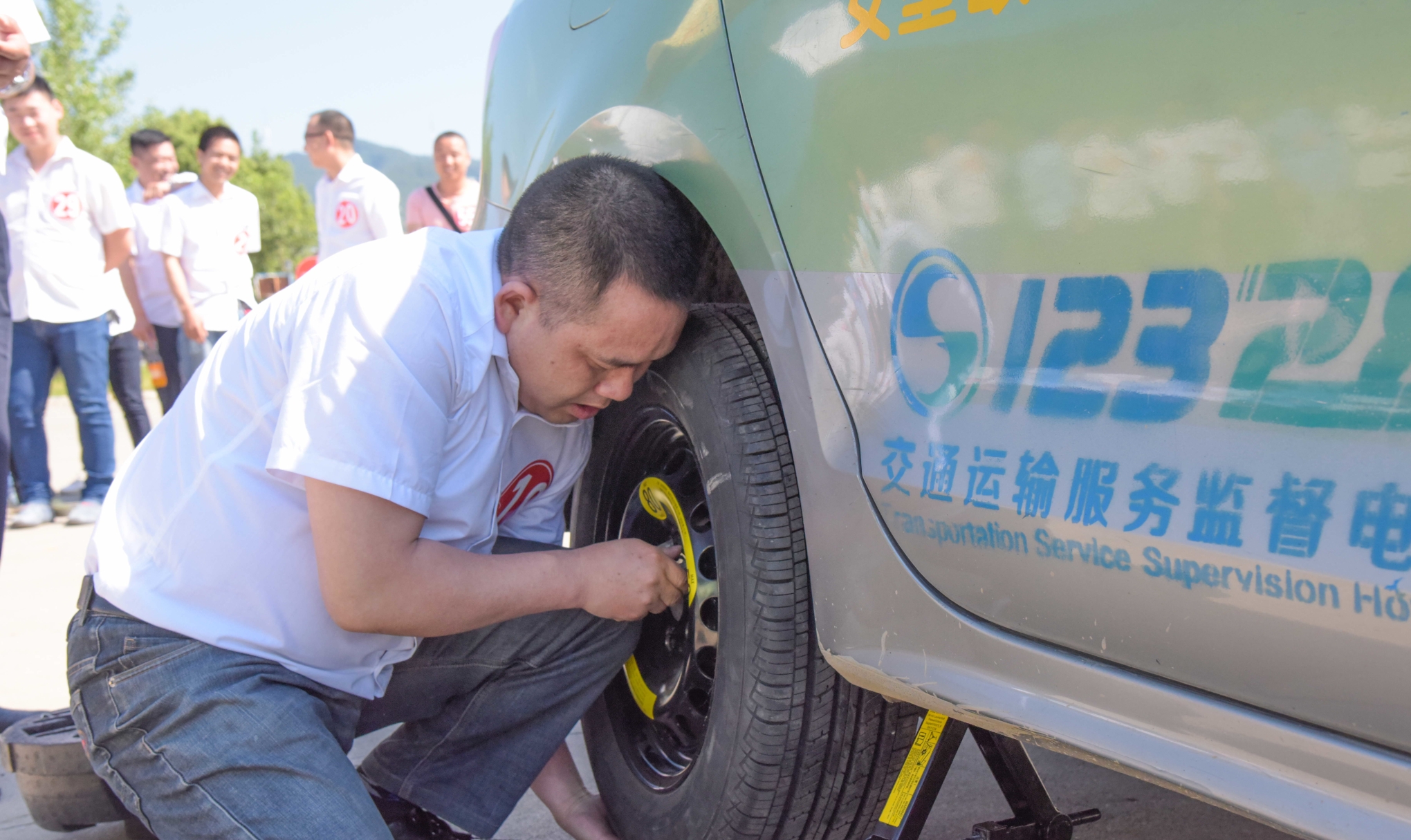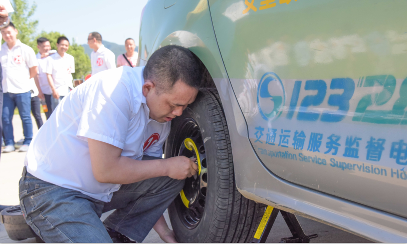 11點整,5分鐘快速更換輪胎競賽正式拉開戰(zhàn)幕,選手們按照抽簽號各就各位,8人進行一組賽事,考核規(guī)定未在規(guī)定5分鐘內(nèi)完成輪胎更換的每延遲30秒扣5分,輪胎安裝不規(guī)范扣5分,工具備胎收放不規(guī)范的扣5分。