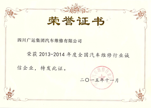 廣運(yùn)集團(tuán)維修公司被中國汽車維修行業(yè)協(xié)會(huì)授予“2013-2014年度全國汽車維修行業(yè)誠信企業(yè)”稱號。