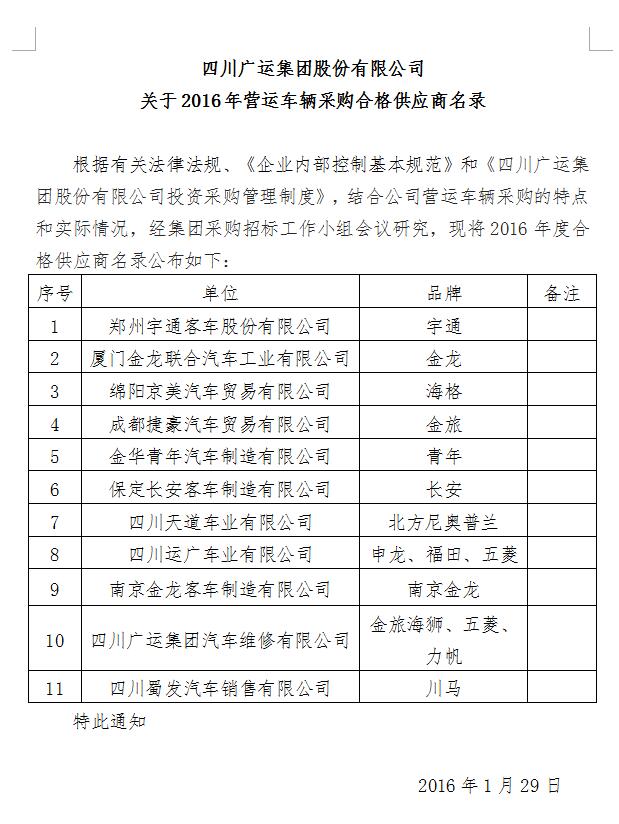 四川廣運(yùn)集團(tuán)股份有限公司關(guān)于2016年?duì)I運(yùn)車輛采購(gòu)合格供應(yīng)商名錄