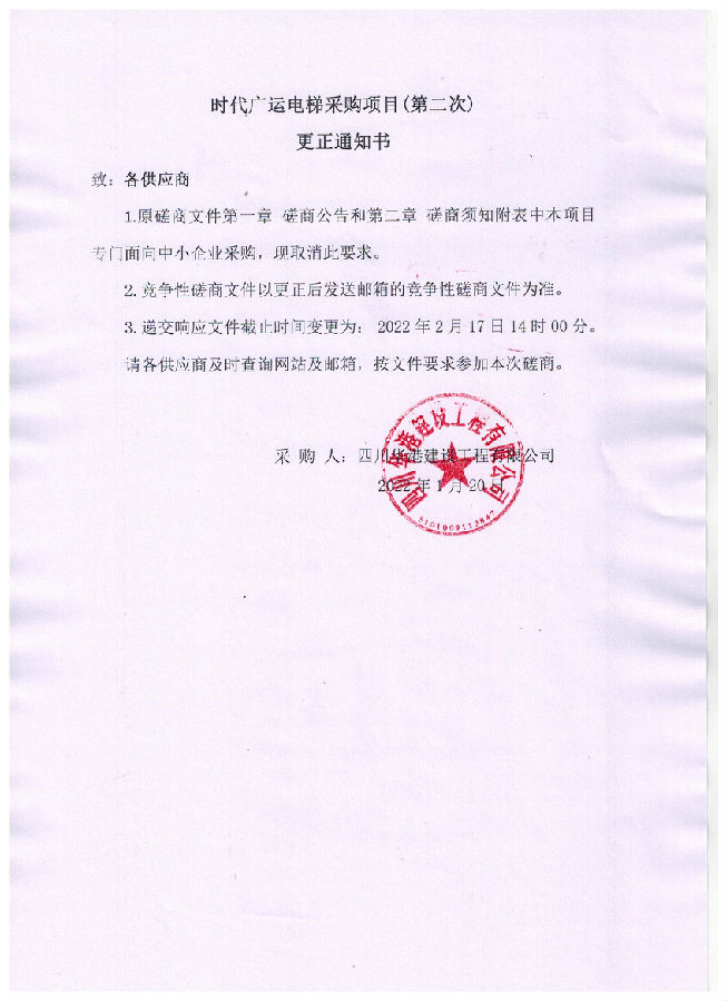 時代廣運電梯采購項目(第二次)更正通知書